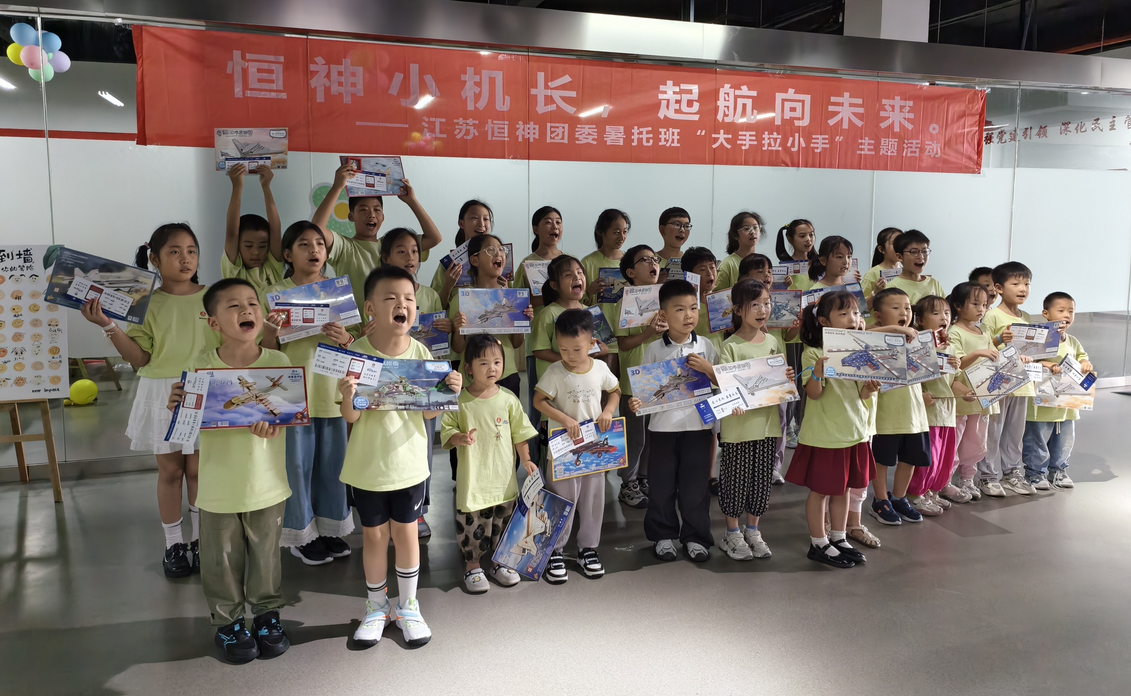 8月12日下午,恒神股份愛心暑托班的活動場地變身歡樂航空港,約50名職工子女化身 “恒神小機長”,在團委青年們的帶領和陪伴下,開啟了一場充滿歡笑與成長的航空主題奇妙之旅。這場以 “恒神小機長?起航向未來” 為主題的趣味游戲活動,讓孩子們在輕松愉快的游戲中收獲了知識、初步建立了團隊互助協作的觀念。開場破冰:舞蹈牽情誼,小隊齊集結隨著歡快的音樂旋律響起,活動正式拉開帷幕。5名團委青年與孩子們手拉手圍成圈,跟著節奏蹦跳旋轉,原本有些靦腆的小朋友們很快被活潑的氛圍感染,大廳里瞬間充滿了銀鈴般的笑聲。這場破冰舞蹈就像一根無形的線,迅速拉近了青年志愿者與孩子們的距離。在簡要的自我介紹后,大家通過抽取彩色手環,分成了紅、黃、藍、綠、白五支小隊,展開了一場場趣味比拼。趣味闖關:航空主題游戲里的知識與協作折紙飛機環節迅速點燃了孩子們的激情。大家拿著 A4 紙,跟著領隊老師學習折疊技巧,有的還別出心裁地畫上笑臉和花紋。“三、二、一,起飛!” 當數十架紙飛機穿過 “書架圓環” 時,大廳里爆發出陣陣歡呼。“我是拼圖小能手” 環節堪稱對 “速度與協作” 的考驗。當飛機拼圖被分發到各隊時,孩子們立刻圍坐在一起,七手八腳地開始拼接。“這塊應該在這里!”“不對,看機翼的形狀!” 團委志愿者們在旁耐心引導,既不包辦代替,又及時給迷茫的小隊員們支招。最終,各支隊伍都順利完成了拼圖任務。“飛機連連看” 游戲成了記憶力大比拼。孩子們盯著倒扣的紙牌,時而蹙眉思考,時而拍手歡呼,團委志愿者們則在一旁計時鼓勁、還要熱心的小朋友不時用掌聲鼓勵加油。最終,所有孩子都贏得了木制飛機模型拼圖,獲勝隊伍的小朋友還優先挑選了心儀的款式。溫情收尾:徽章與機票見證成長,愛與理念扎根心間活動尾聲,每位小飛行員都領到了閃亮的 “恒神小機長” 徽章,驕傲地別在胸前。當印有每個孩子名字的 “結業機票” 被鄭重頒發時,不少小朋友舉著機票和模型向志愿者們開心地道謝。本次活動旨在讓職工子女在歡樂中感受航空精神,同時通過青年志愿者的陪伴,傳遞企業對員工家庭的關懷。這場持續兩小時的活動,像一根堅韌的 “情感碳纖維”,將企業、家庭與孩子緊緊相連。恒神團委的青年們用熱情與愛心,為孩子們的暑假添上了一抹明亮的色彩,也讓 “愛與未來一起飛” 的溫暖理念,深深扎根在每個人心中。